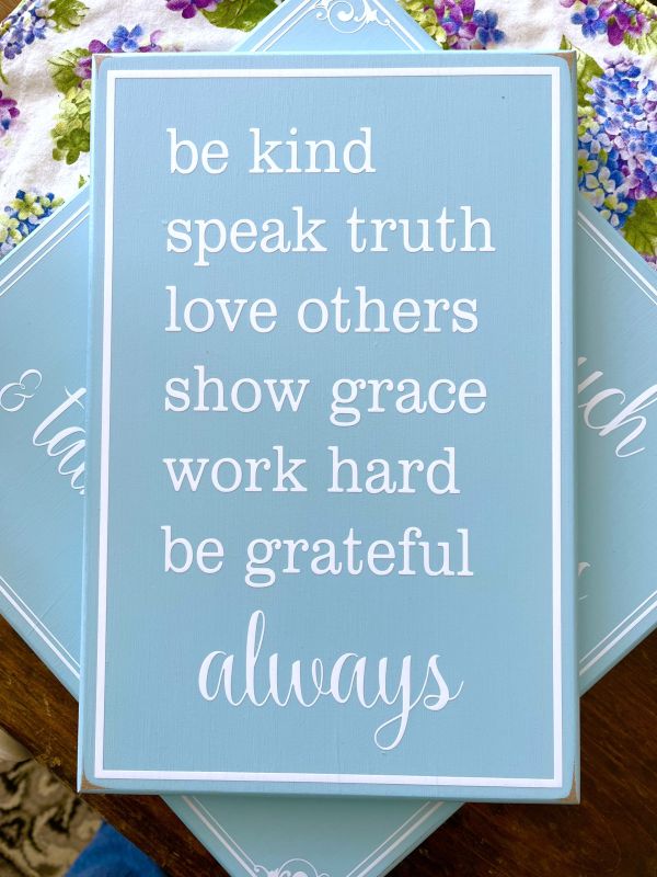 Inspirational family words to live by. Handcrafted wood sign available in two sizes and several colors. Painted worn finish.